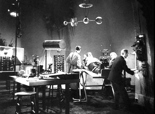 They needed a monster movie-type setting for model makers to construct, with a lot of individual pieces that could come together to form a coherent scene. Inspired by the 1939 Universal pic Son of Frankenstein, they decided on a mad science laboratory, which would include a big operating table that you could strap a monster to, as well as electrical equipment, control panels, a hanging skeleton, and tables strewn with beakers and test tubes and what-all.
