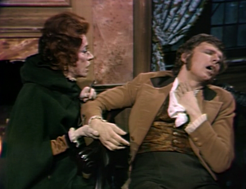 The Trask/Barnabas vendetta is always fun to revisit in each time band that Barnabas travels to, but with each successive Trask appearing more unprincipled as they go along. Here in 1840, the makeup department is applying the same sinister black shading around Lamar’s eyes that made Barnabas seem so dark and distant upon his arrival in 1967. In a sense, over the course of the series the roles between the two characters become reversed.