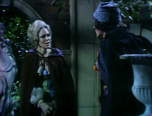 And then there’s the palm-reading scene, which is about as close to a comedy sketch as you’re going to get on Dark Shadows. Angelique’s decided that she needs to cast a spell over something to find out if Gerard is actually Judah Zachery, so she tells Laszlo to drop by the house and steal Gerard’s watch fob.