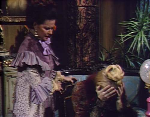 They’re talking about an old curio that Flora’s son Desmond picked up on sale on Macau, and brought home as a conversation piece that can keep up its end of the conversation. Flora knows that it’s the head of Judah Zachery because her son Desmond told her it was, and Gerard knows that the head of Judah Zachery was in this house, because a) Gerard knows that Desmond brought it to Collinsport, b) Gerard has handled it himself, and c) Gerard actually is Judah Zachery, and should therefore be entirely up to speed on everything Jay-Z related.