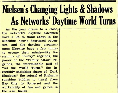Here’s the bad news: as of today, Dark Shadows has 14 weeks left to run. There’s this week between Christmas and New Year’s, and then one more cycle of 13 weeks, and on April 2nd, Dark Shadows wraps at ABC Studio 16, and that timeslot goes to Password.