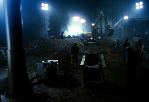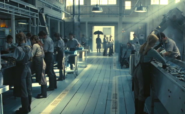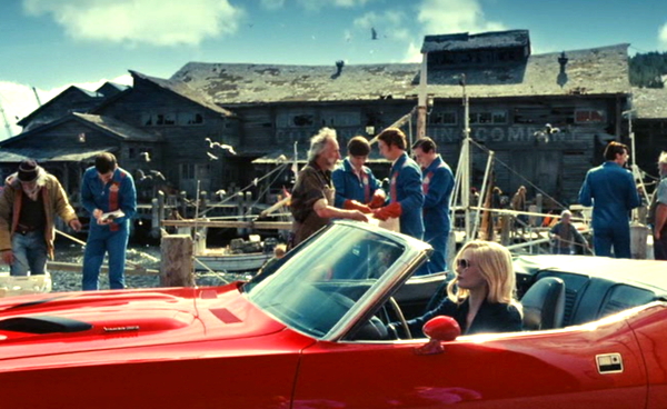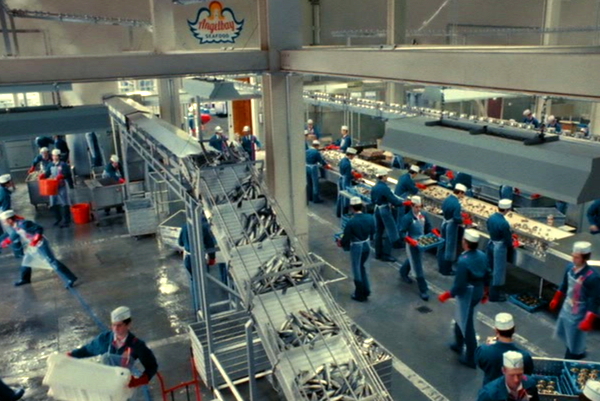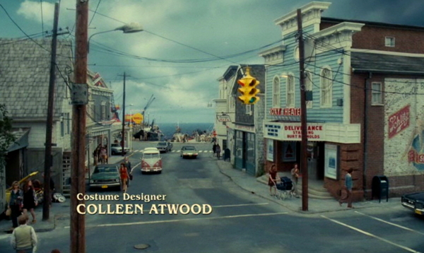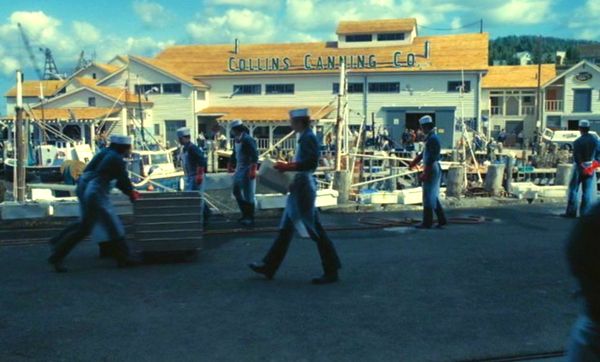 So this whole thing — the harbor, the canneries, the Blue Whale, the gas station, the movie theater, all the streets and cars and stores and everything — it’s all one big Disneyland-style outdoor set, constructed around a purpose-built water tank so big that they could sail real boats on it. The edges of the set are ringed with greenscreens so that they could key in the sea and the sky; everything else was built by hand.