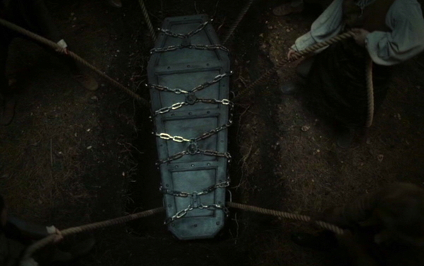 Anyway, the flashback barrels on, as we see Angelique lead a mob of ignorant villagers, to bind Barnabas in a box and bury him for apparently ever. End of flashback, now on with the show.