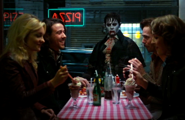 So I said OK to all the Maggie/Vicki stuff because that’s just how it goes in this alternative version of DS and who cares about Vicki anyway? She’s a prop ….and the people who made the movie thought so too. I did like her ghost friend – nice CGI. Later, I liked her back story and felt sorry for her when it turned out she had a lot in common with David, except he was lucky enough to have a family that tried to help him instead of a family that threw him to a mental institution. The whole ghost of a former life thing? I didn’t think of it that way when I first saw the movie but it does feel weird. …well, it did until I watched the episode of “What We Do in the Shadows” where the vampires realize that since they died they also have ghosts of themselves. I guess nothing stays weird for long in fiction.