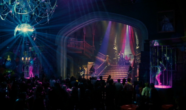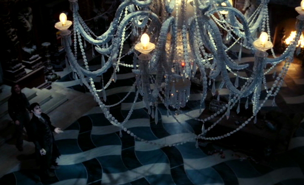 Here we are in Collinwood at last, another gorgeous set that I’m going to be relentlessly positive about. This was shot at Pinewood Studios, and it’s 64 feet by 101 feet, and 32 feet in height; I don’t know the figures on the original set, but this is a lot of Collinwood all in one place. It’s got a blue and white wave pattern on the floor, bigger than life-size carvings of mermaids and mermen and a crystal octopus chandelier that I absolutely adore. Everything undulates.