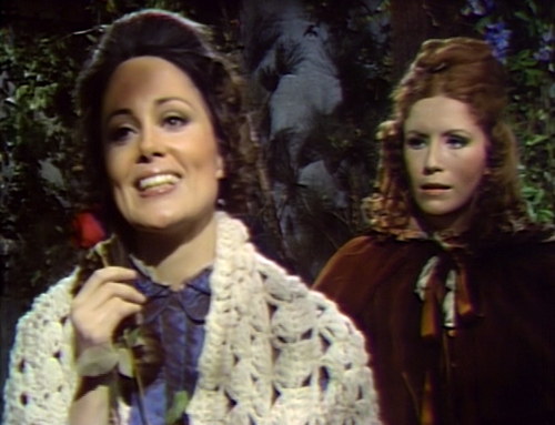 You see, at the end of yesternight’s episode, the deceased Joanna Mills, Quentin Collins’ former mistress, showed up at the front door of Collinwood, and told Samantha, Quentin’s wife, that she wanted to talk to her sister Daphne, Quentin’s current mistress.