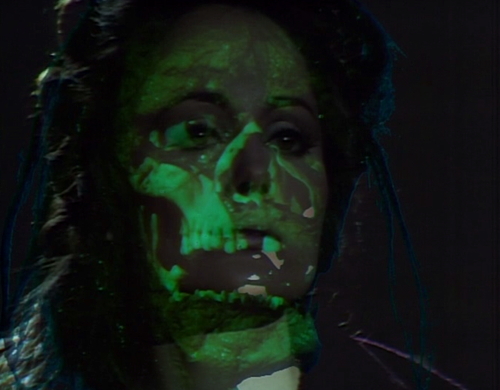 Collinwood has been haunted since its construction, but we’ve never seen a ghost like this before: an apparently undetectable tatterdemalion that covers up its luminous green putrefying skull face and passes for approximately human, or as human as anyone else in 1971 Dark Shadows. She sits and chats, and asks Daphne how she slept last night, and nobody ever knows the difference.