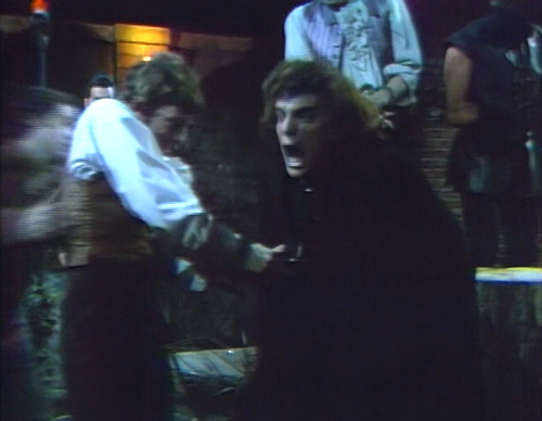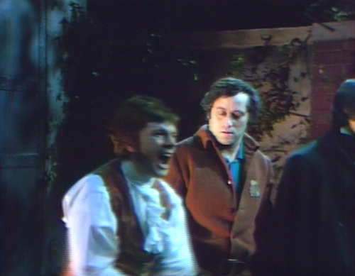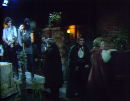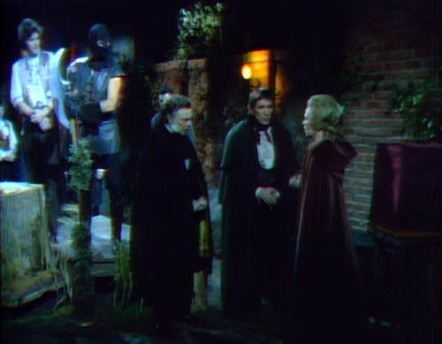 And the crowd goes wild, to the extent that they can, given the limited carrying capacity. There are ten people in this scene, which as far as I know is the all-time record for Dark Shadows, and they’re all trying to act on the same set at the same time, while the cameras lurk around the edges and film whatever they can get a half-decent shot of. It’s a long, narrow set, so the actors have to stand in a line like it’s a stage play, and if they have any emotions to express, they need to do it within their allotted square footage. A lot of the time the camera isn’t pointed at the person who’s talking, and there are at least a couple of characters who you don’t even realize are in the scene, until they start talking, and you figure they must be in there somewhere.