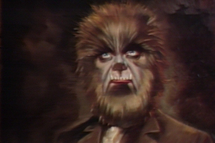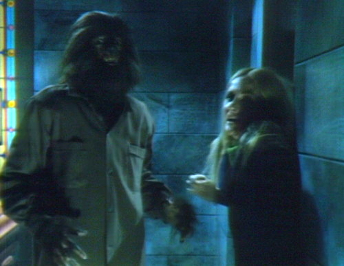 Then she thought she heard someone moving about halfway down the auditorium on the left. Her terrified eyes fixed swiftly on that spot. For a moment, nothing seemed to disturb the shadows. And then suddenly a figure rose up from between the rows of seats — a figure so frightening that she at once reacted with a scream. It was a man with the distorted features of an animal! A man with a wolf-like face! And he was coming toward her!