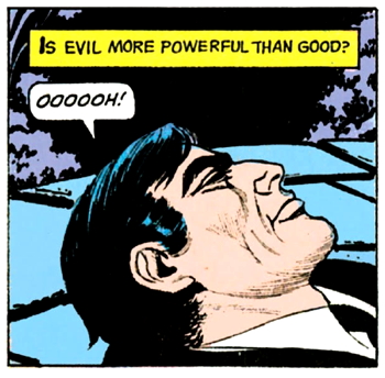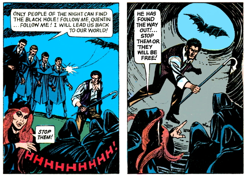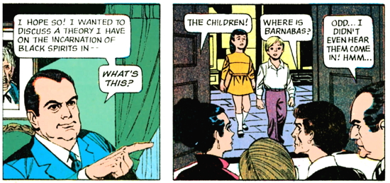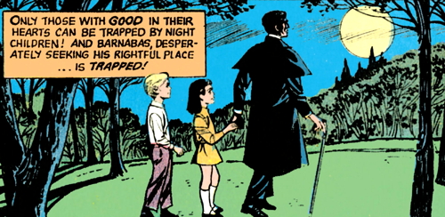 So now we’re just playing Calvinball, there’s no other word for it. These characters are going to continue to postulate new rules from one panel to the next, and there’s no way to stop them. Barnabas falls prey to the Night Children because he’s good, but he can fly into the black pit because he’s not that good; if Angelique finds him, then he’s doomed, but she finds him immediately and he magically flies away; silver is good, and squares are good, and the moon is chaotic neutral.