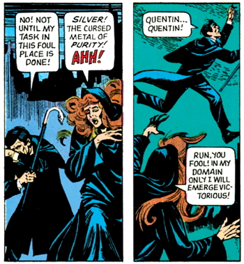Luckily, he’s brought his cane with him, which Angelique recognizes as Silver! The cursed metal of purity! AAH!