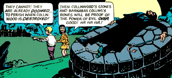 At least, he falls over backwards, and stays that way for long enough to allow the children to construct a homemade burial platform out of stones and moonlight, and leave Barnabas there to await the sunrise. “It is the only way!” Andras explains. “Even we do not have the power to destroy one of our kind!” This is a convenient plot contrivance that allows them to finish the page and move on to the next one, which is the only thing that the creators of the Dark Shadows comic care about.