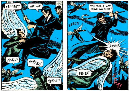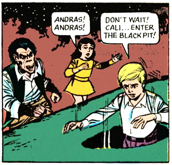 And then Barnabas starts… flying, I guess? It looks like he’s running, but he’s above Angelique, and gaining altitude somehow. Life in the black pit is full of surprises.
