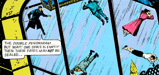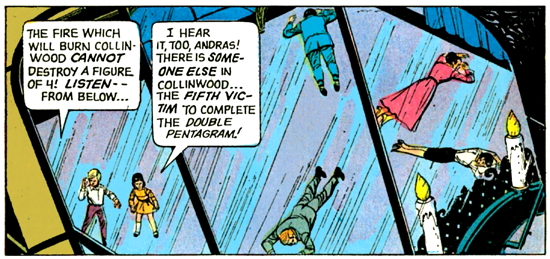 “The figure 4 is a sign of the square!” he boysplains to his female counterpart. “The square is the sign of good! We must have another victim to complete the double pentagram! The fire which will burn Collinwood cannot destroy a figure of 4!”