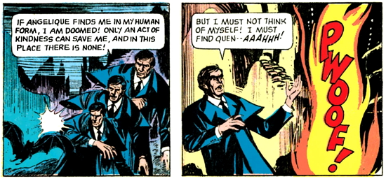 “But I must not think of myself!” he vows. “I must find Quen — AAAHHH!” and with an enormous Marvel Comics PWOOF!, here’s Angelique, finding him in his human form. So that went great, another classic two-panel faceplant from the astounding Mr. C.