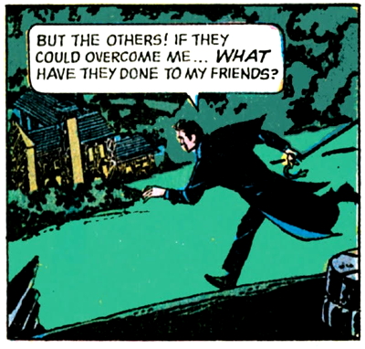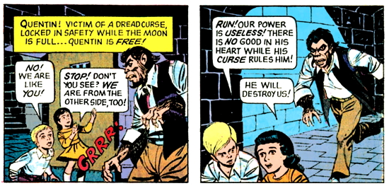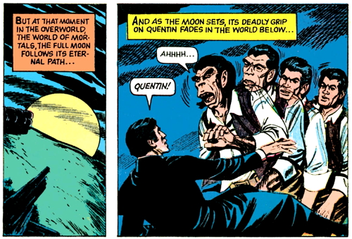 But in the comics and the Paperback Library gothics, Quentin is cursed forevermore, because people remember visuals better than they remember dialogue. The visual of a handsome man transforming into a snarling beast with a snappy wardrobe is easy to fix in the mind, but later on when they explain how he stopped being a werewolf, it’s all words, which people are terrible at remembering accurately.