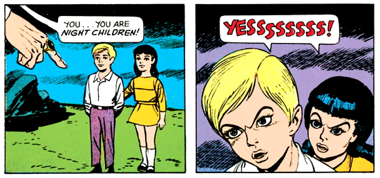 “Nobody with good in his heart can refuse their innocent eyes!” the narration gasps, and then a page later, “Only those with good in their hearts can be trapped by Night Children!” It’s important that they get this across, because these rules are going to start getting more complicated soon.
