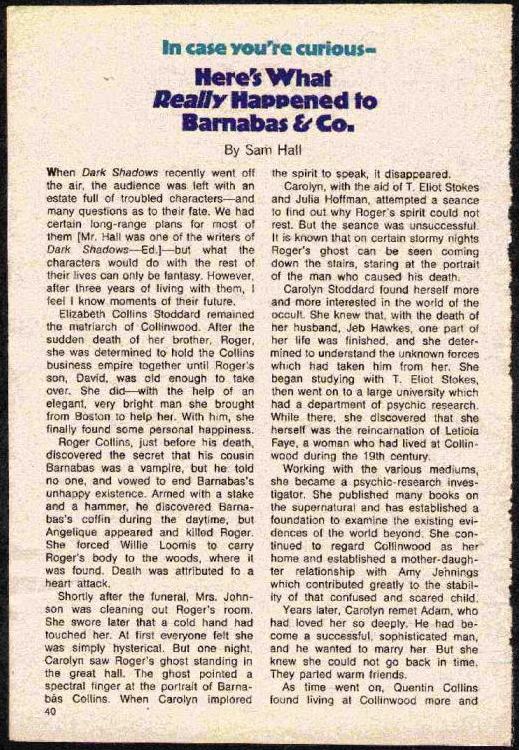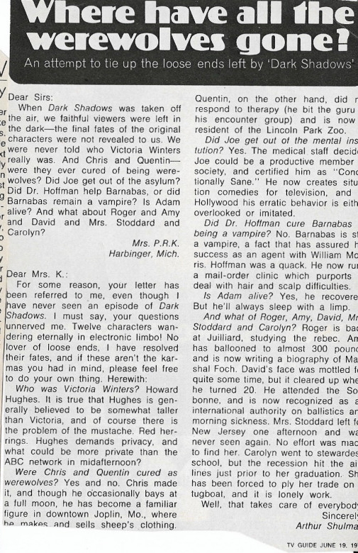 Kosmo13 posted in the comments that there was another, parody version of this concept published in June 1971 (two months after the show ended, four months before Sam’s article). The article is called “Where have all the werewolves gone? An attempt to tie up the loose ends left by Dark Shadows“, and it’s based on a letter sent by a fan, asking questions about what happened to the characters. The questions were “answered” in a joking manner by a TV Guide editor who’d never watched the show. It’s pretty obnoxious and not funny, in line with the magazine’s dismissive review of Dark Shadows published in February 1969. Kosmo13 suggests that maybe fan letters criticizing this treatment was the inspiration for the magazine to ask Sam Hall to write his article, which is plausible.