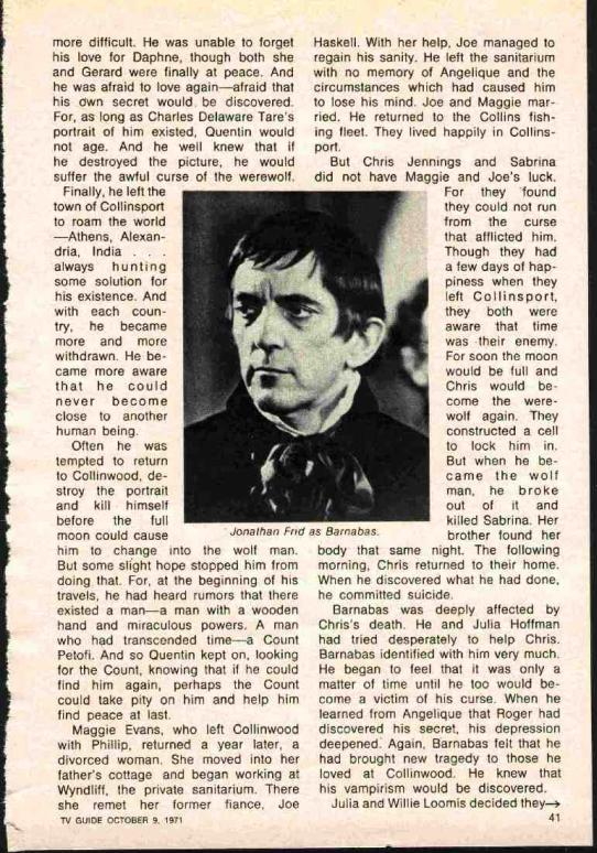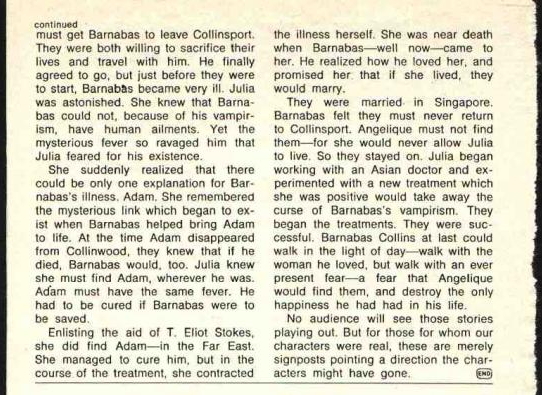 My local ABC affiliate pulled the plug 4 months before the actual end of the show so I was very grateful that TV Guide published this, especially after the previous “Hoffman was a quack” column. I just assumed I missed the Maggie and Phillip story and though I wasn’t happy about the fates of Roger and Chris, I was very happy that Barnabas and Julia were together. I missed the whole thing with Barnabas declaring his love for Angelique (thankfully) so all of this seemed plausible to me. For me, it was canon.