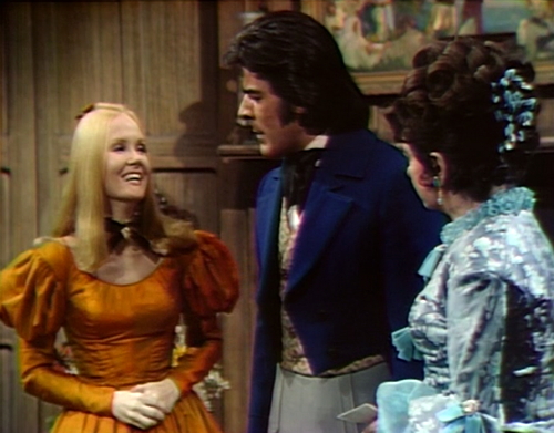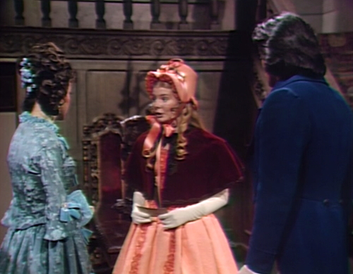 But really, I’m being unfair, because this character is less annoying than the regular 1840 Carrie Stokes, and she’s miles away from the sniveling Hallie Stokes of 1970. She’s a pleasant, polite young woman, who happens to be blessed with the psychic ability to blurt out plot information on request, like a Gilligan’s Island radio announcer, covered head to toe in cherry fondant.