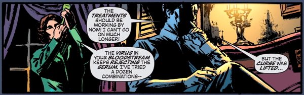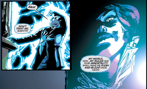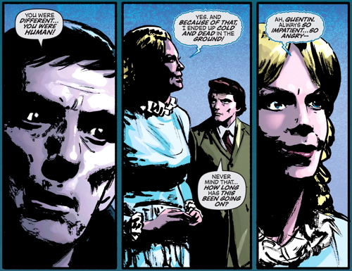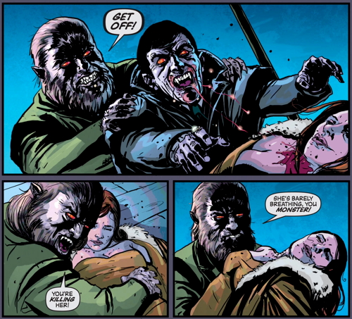 And then he just goes ahead and turns into a werewolf on purpose, which is a thing that Quentin does in this comic book series; he can just turn it on and off whenever he feels like it. Most of the time, he doesn’t even go all the way to full wolf; there’s a scene in issue #4 where he’s got a wolf head and wolf hands, but he’s still able to talk, so that he can tell Barnabas that he’s being an asshole.