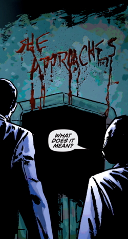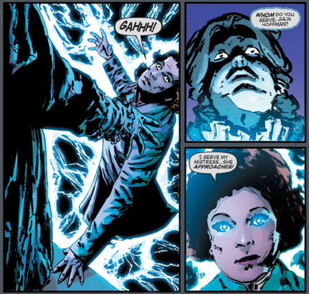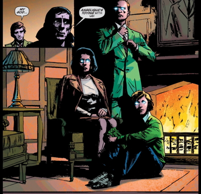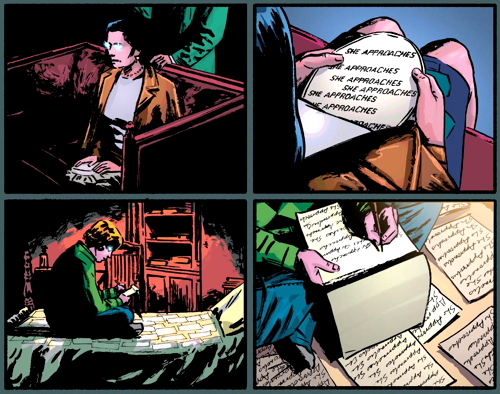 Also, again retrospectively, by the end of this issue we’re going to learn that David, Liz and Roger are all possessed by Angelique and they’ve been obsessively writing the phrase SHE APPROACHES for I don’t know how long, so why everybody is currently surprised to see this I don’t really know. There is a lot that I don’t understand about Angelique’s current plan.