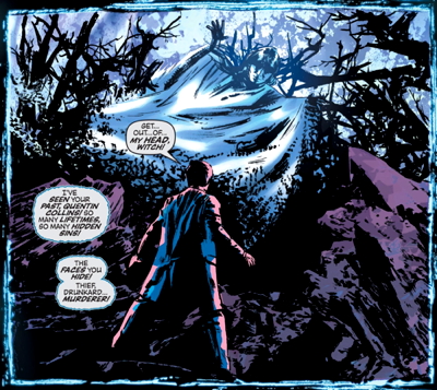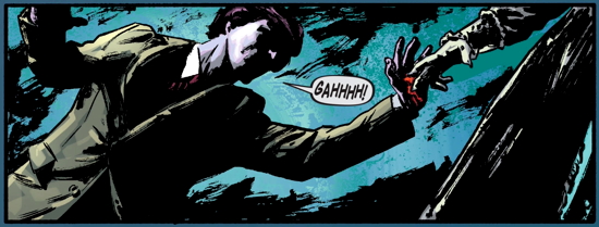 So now it’s time for the nonsensical reveal that I mentioned at the end of issue #1, where Julia pushes Quentin forward so that he falls against the statue’s outstretched fingers, and he gets two little cuts on his hand from the statue’s nails or something.