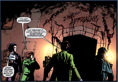 Okay, issue #2, where Roger tells his teenage son, “David Collins, get down here this instant!” because somebody’s written SHE APPROACHES in blood over the front door, and Roger thinks that inscribing a supernatural threat on the wall in human body fluids is a common prank that one plays as a teenager, especially at home, where there are no other suspects except you.