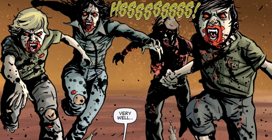 On ABC-TV’s Dark Shadows, people got locked up and menaced a lot, but you never saw, for example, a pack of murdered children slaughtering their own parents in a damp cave, like we do in Dynamite issue #9, because that’s gross and depressing, and it would make the housewives in the audience less interested in buying L’eggs pantyhose and Ken-L-Ration dog food. The housewives would take one look at that murderous horde of rampaging child zombies, and they’d say, how am I ever going to get those stains out? And just look what you’ve done to your dress slacks! The show wouldn’t last a week.