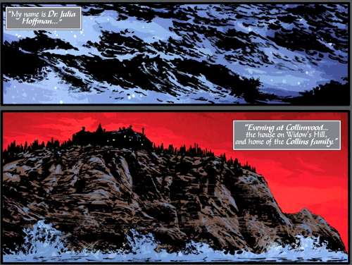 In this series, Campbell’s main concern is fidelity to the sets; in the trade paperback, there are seven extra “behind-the-scenes” pages by Campbell, and five of them are about the backgrounds. He says that he created a 3D model of the Collinwood and Old House sets so that he could get authentic camera angles, and you have to admit he nailed this shot out the drawing room doors, with the staircase and the newel post in the background. Say what you like about the art in this comic, the man knows his newel posts.