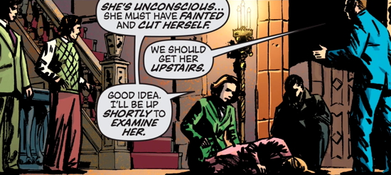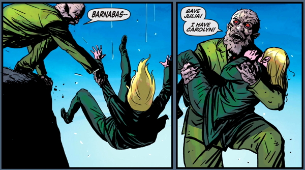 Now, the retrospective problem with this cliffhanger construction is that we’re going to learn at the end of issue #2 that Julia is actually the one who inflicted these wounds on Carolyn, which means that after the assault, Julia must have dropped Carolyn on the ground and then walked around in a circle, just to pretend to be shocked that Barnabas apparently attacked somebody that she actually attacked herself.