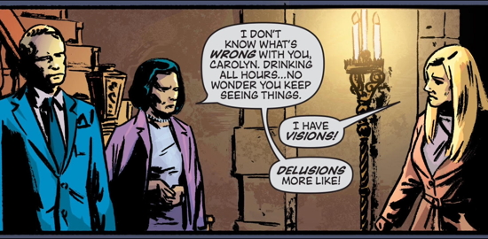 Because that means that yet another element of the first issue cliffhanger was false — Liz, Roger and David finding “SHE APPROACHES” written in blood in the foyer, which they pretended was a mystery even though they’ve all been part of the “she approaches” club from the beginning. So everything that happened in the first issue was basically stagecraft for, I guess, Quentin’s benefit? I don’t know.
