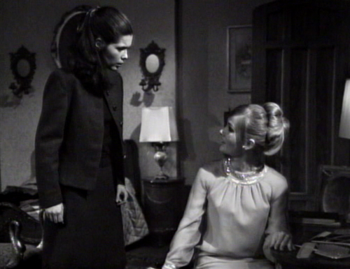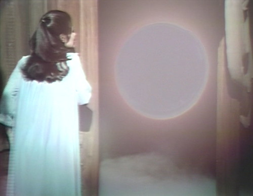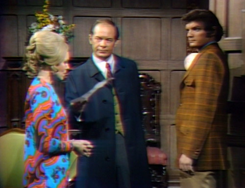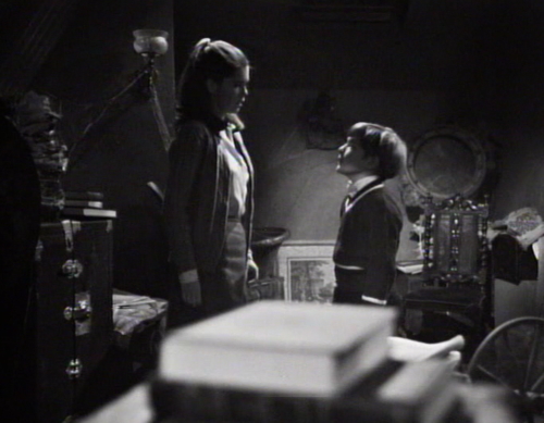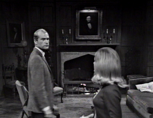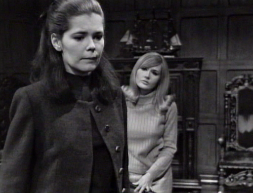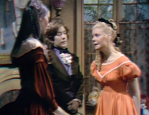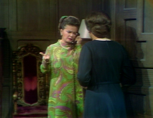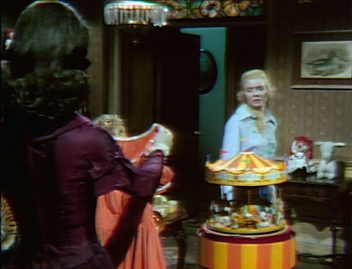 And what the Hell TIME is it supposed to be? Daphne first came to Collinwood to tell her sister of her nuptials at 12:30 AM. Catherine ran to Bramwell (another twenty minutes) then Carrie skips down the stairs to chat with Daphne, having just visited Melanie (at almost one in the morning). Catherine returns and talks with Daphne, in front of the mantel clock which reads 11:35. Over at Bramwell’s, Josette scolds her son in front of the mantel clock which appears to read 10:40. Josette goes out to the great house, but the clock there still says 11:35. Daphne drops by the caretaker’s cottage, where Carrie is up and about and mentions that her father is out working. This time they manage to keep the clock out of the shot, but it must be after one in the morning by now.