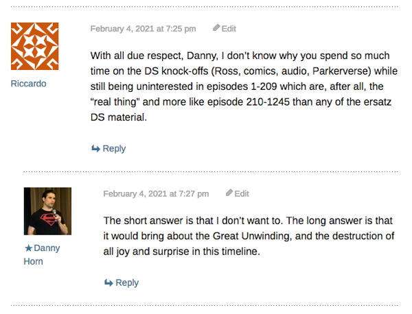 1. In the next post, I explain in some detail why writing about those episodes is not possible for me. I don’t have much else to say about it, but if people have questions after reading Episode 1219, then my associate Sue Agatha, a three thousand year old poisonous pyramid lizard, will handle all further inquiries.