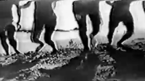 SHE APPROACHES, she stitches into the needlepoint in her lap. SHE APPROACHES. SHE APPROACHES.