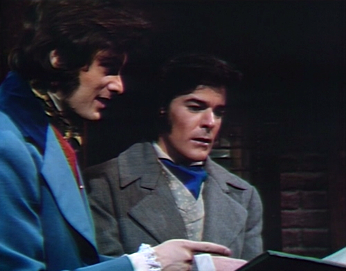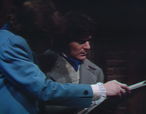 Let’s review the case. Last week, while adopted dimbulb Melanie Collins was possessed or dying of the plague or whatever, she started emitting the not-really-clues type of clues that Dark Shadows uses whenever they have something generally in mind, but want to buy a little more time to get there. You can always tell when it’s one of those scenes because the ghosts use a lot of unheralded pronouns: she’s dead, he’s coming, we tried to stop them, and so on.
