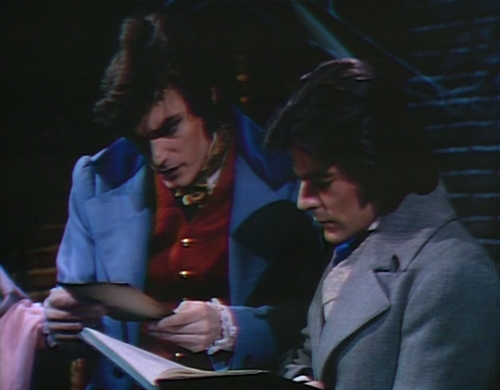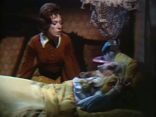 Let’s review the case. Last week, while adopted dimbulb Melanie Collins was possessed or dying of the plague or whatever, she started emitting the not-really-clues type of clues that Dark Shadows uses whenever they have something generally in mind, but want to buy a little more time to get there. You can always tell when it’s one of those scenes because the ghosts use a lot of unheralded pronouns: she’s dead, he’s coming, we tried to stop them, and so on.