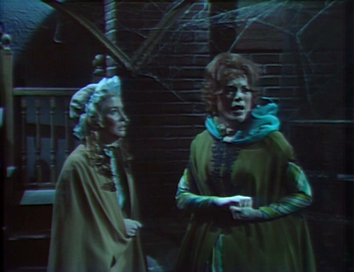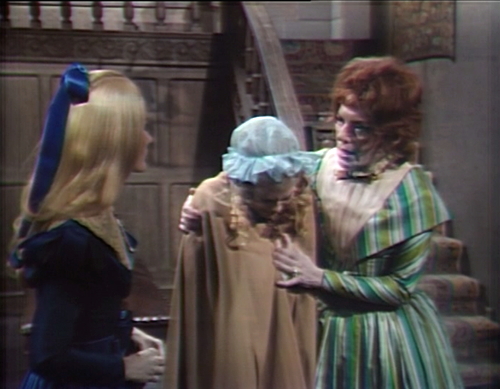 Plus, all the action is happening in Carrie’s basement, so she’s a part of the case whether Julia likes it or not. Carrie runs from the gatehouse to Collinwood to tell somebody that Morgan acted weird and then went down to the basement, and now Julia and Carrie run back from Collinwood to the gatehouse, to go to the basement and see Morgan acting weird. Morgan’s alive but unconscious when they arrive, so whatever Brutus was doing with his chromakey hands was serious but not permanent.