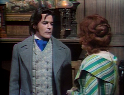 James declares his unwillingness to help Julia in any way, then strides through the foyer and… up the stairs? Is he going to spend the rest of the evening with Catherine? In Collinwood, with all the hated Collins family?