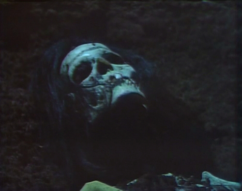 Then Julia leans down to tend to Morgan, and that old familiar wind-and-kettle-drums sound returns. “It’s him!” Carrie yells. “It’s the spirit! He doesn’t want you to touch him!” and then it’s after that that the pair finally catch sight of the skeleton in the shallow grave about two feet in front of them. They’ve been standing there in the basement for more than a minute by that point, plus a commercial break, so I don’t know why they didn’t notice the excavations. I get that there’s a lot going on, but skeletons in black wigs tend to catch the eye.