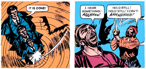 And with one bound, Barnabas is free, slipping the surly bonds of earth and turning into a ravenous bat creature, who attacks the nearby pirates and disarms them.