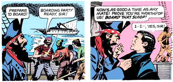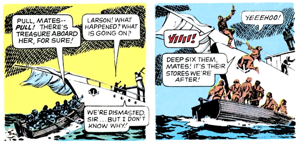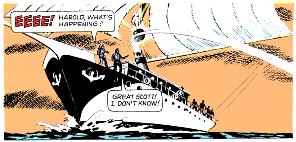 “Harold! Someone’s holding me! Can’t you see?” says the blonde girl in the pink top, and Harold — expertly attired for his sea voyage in a tasteful brown suit — says, “There’s nobody but — UNGH!” Meanwhile, another capitalist pig shouts, “Show me what to do, captain, and I’ll — AGH!”