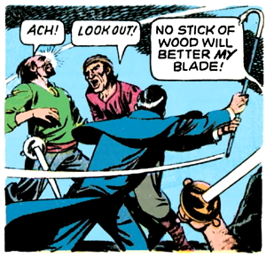 Naturally, this turns into a cane fight. Barnabas is up against about seven different pirates, and actually holds his own pretty well for a couple of panels, until one of the pirates sneaks up behind him and clocks him on the head with the flat of his sword.