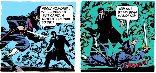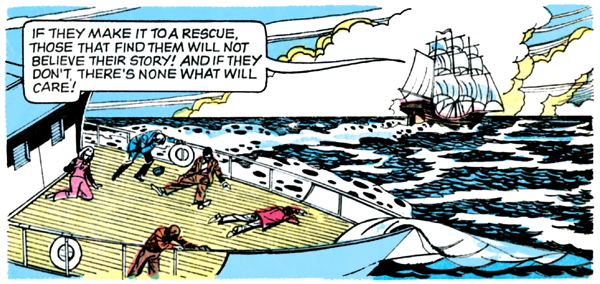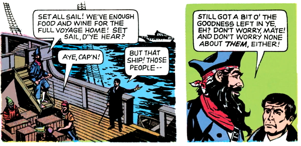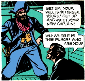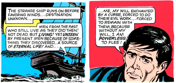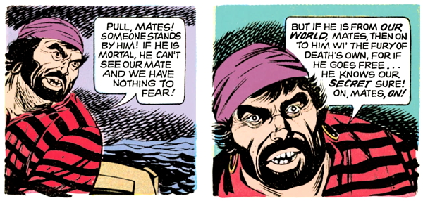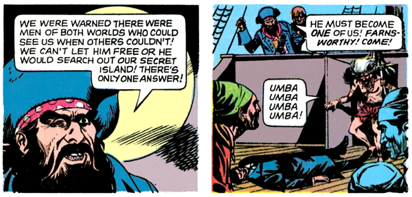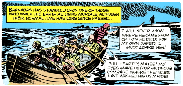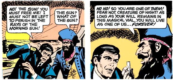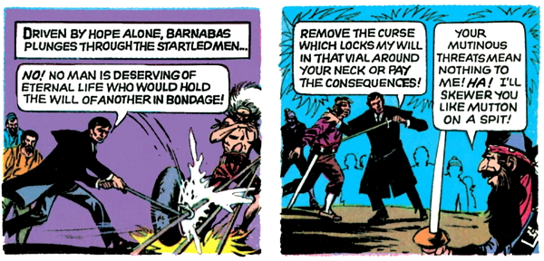 Dread Pirate Targut looks at Barnabas and intuits that he’s a man of both worlds, who can see eternal invisible people. In a couple of pages, the captain will recognize that Barnabas is a “creature of night”, but he hasn’t caught on to that yet, so apparently, there are several different types of people of both worlds. I don’t know what the other ones are.