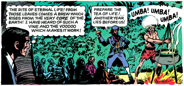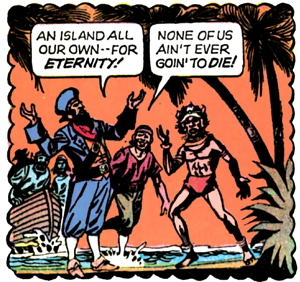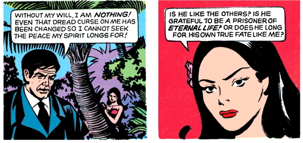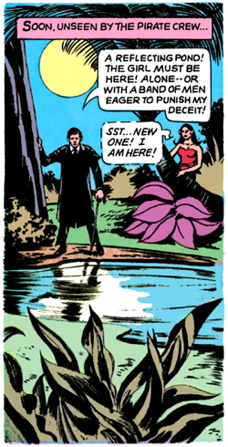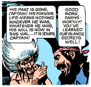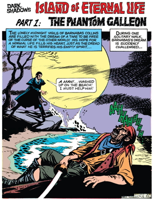 Lani spends a page and a half explaining the island’s backstory to Barnabas, which involves the pirate gang kidnapping a wicked island sorceror, who revealed to them the secret of eternal life.