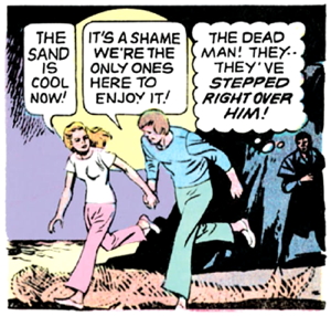 But then his solitude is interrupted by a couple walking together in the moonlight, who saunter right over the pirate corpse as if it isn’t there. This provokes a whole series of postulates, and as we all know, if Barnabas makes a declaration then it immediately becomes true, thanks to protagonism.