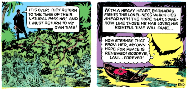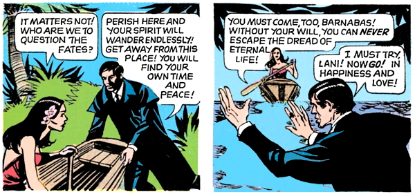 Then he breaks Lani out of stir and sends her off with a little outrigger to paddle away to freedom, which in this case means that she’ll grow old and die, returning to her loved ones who died so long ago. She wants Barnabas to come with her, but he tells her, “Now go! In happiness and love!” and that’s kind of sweet, if you want it to be.