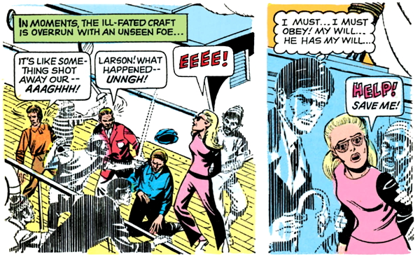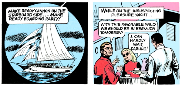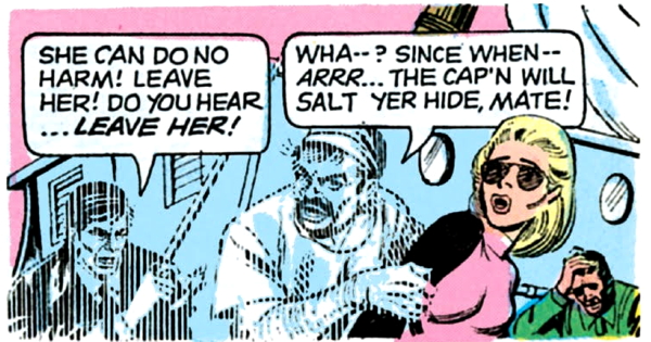 Gold Key wants us to enjoy the imminent sacking and pillaging, so they very economically set up a boat full of people that we instantly hate. I don’t know why the phrase “I can hardly wait, darling!” uttered by a white lady in sunglasses activates my schadenfreude gland this way, but what the hell, let’s enjoy ourselves.