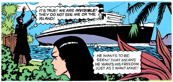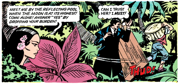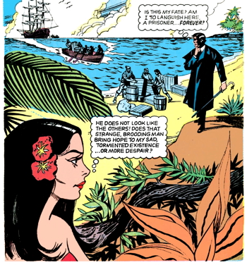 The romantic jungle girl is a prisoner on the island as well, and probably not a happy one, if I know pirates. She decides that Barnabas can help her to escape, so she whispers at him from the underbrush that they should team up.