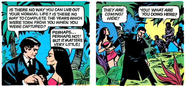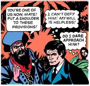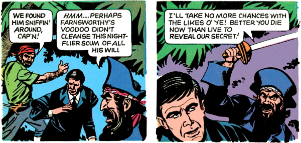 The pirates get annoyed with Barnabas for pretty much still having as much of a will as ever, so they grab him and Lani, and spend a couple pages threatening them. Lani tries unsuccessfully to save Barnabas as per jungle girl regulations, and we get some more exposition from the pirate captain about how things work in this dump, which seems to have just as many random rules as the Lost island.
